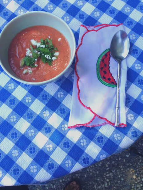 Gazpacho es una de mis sopas favoritas del verano. Es fresca y nutritiva y llena de vitaminas grandes ya que es crudo; sopa fría de perfecto para una tarde de verano o la noche. Una variación favorita de esta sopa fría antiguo originario de la región andaluza de España, implica agregar sandía y perifollo a la base de tomate. Esta adición reduce la acidez de la base de tomate y le da una dulzura fantástica para complementar los tomates.