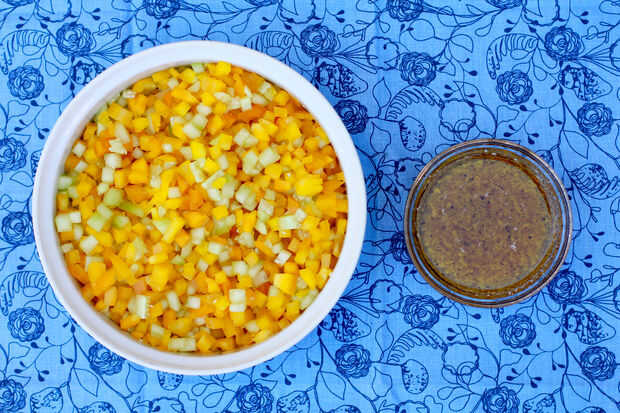 2. pelar el pepino. Base de ají amarillo. Trocear finamente el pepino y el pimiento amarillo.