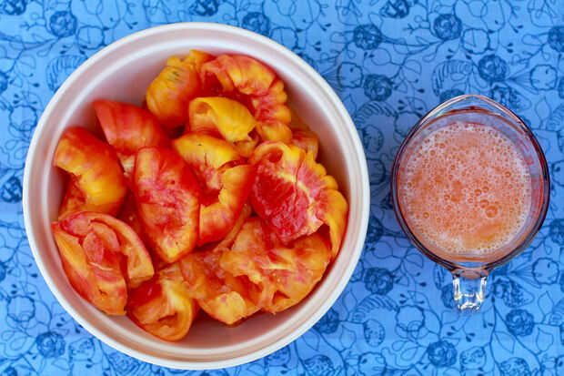 1. la base y semillas de los tomates sobre un tazón. Reservamos el jugo de tomate y colar en un vaso de medida. Añadir el agua, a la igualdad de 1 1/2 tazas de líquido.