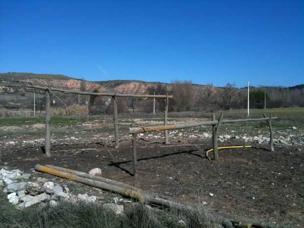 La construcción debe ser extraíble y reutilizable de madera. También, quiero una forma fácil de montar y desmontar así y utilizado en forma de U naturales troncos enterraron en la tierra para suporting las vigas. Consiguió conectar por medio de trozos de varilla de 16 mm roscado, flanger arandelas y tuercas de fijación.