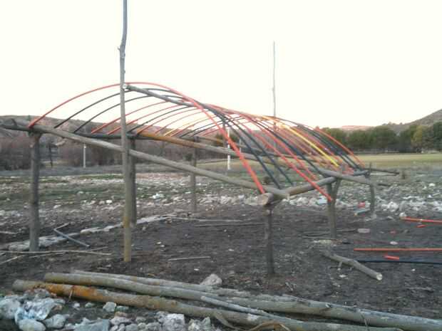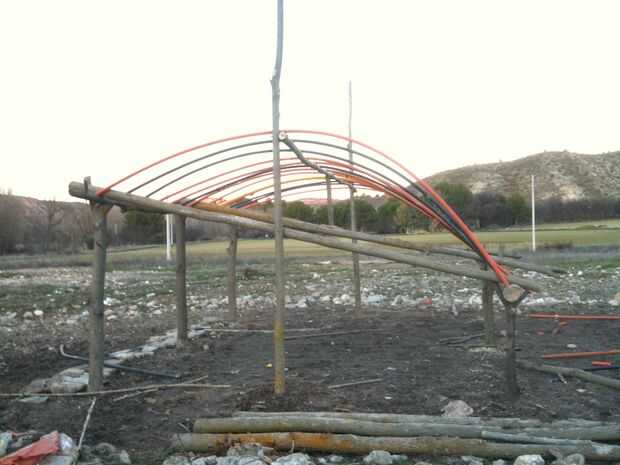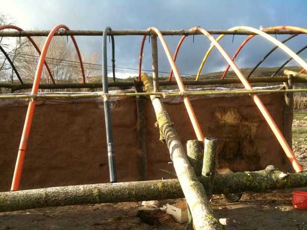 En mi caso, hice un haz largo y fino en la parte superior las columnas laterales que me proporcionan un punto de flexión para las costillas de conducto. Por supuesto, las piezas que encontré where'nt bastante tiempo así que hice la conexión de clavijas de madera dura y atornillarlas junto. Tengo esas longitudes medida cortadas para caber la parte inferior de la estructura principal (de curso todos ellos son ligeramente diferentes debido a las irregularidades de los registros encontrados, pero en cuanto se doblan en la parte superior en el mismo punto un hacen de la misma forma se puede). Conectado a la estructura principal de madera por medio de piezas de ribar, cortada en ángulo para fácil clavado y martillados en orificios taladrados en los troncos. Tengo una costilla cada 40 cms más o menos.