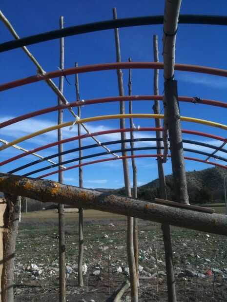 Luego puse refuerzos transversales de caña (gratuito, cerca del río). Puse las cañas sobre cada 40 cms aprox. les ata contra las costillas del tubo con cinta adhesiva. Una de las mejores cosas de esta forma de construcción es que están adivinando las medidas todo el tiempo pero realmente puede dejar la cinta métrica en la caja. Puede ser todo ojo-lanzada. Medidas exactas no son muy útiles cuando se trabaja con materias primas naturales.