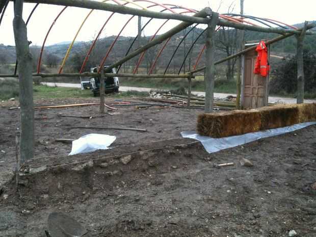 Obtener una lámina de plástico sobre la base y empezar a establecer strawbales en el lugar.