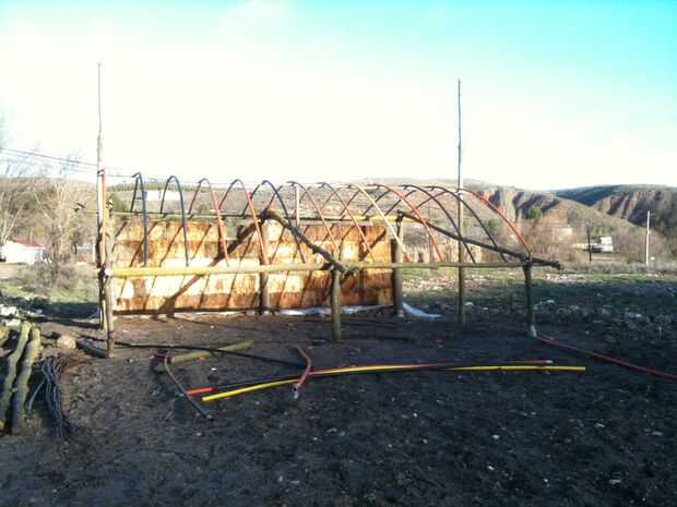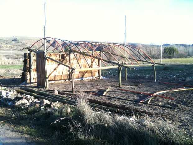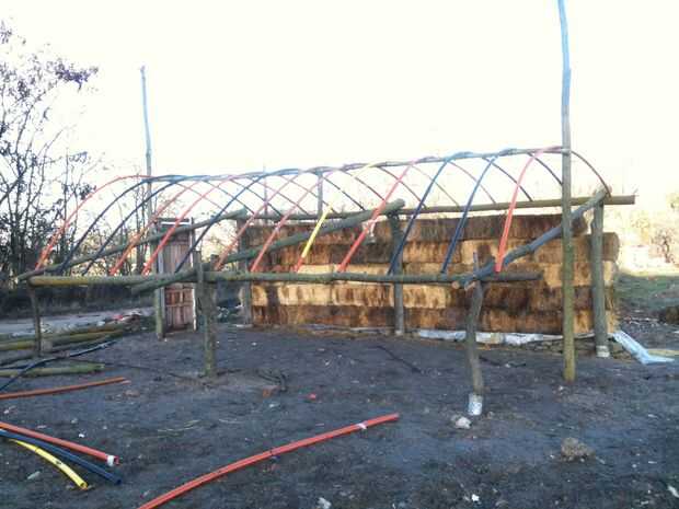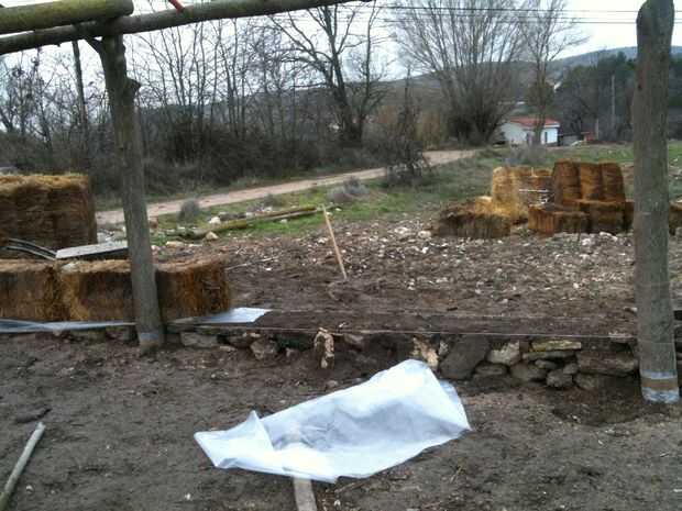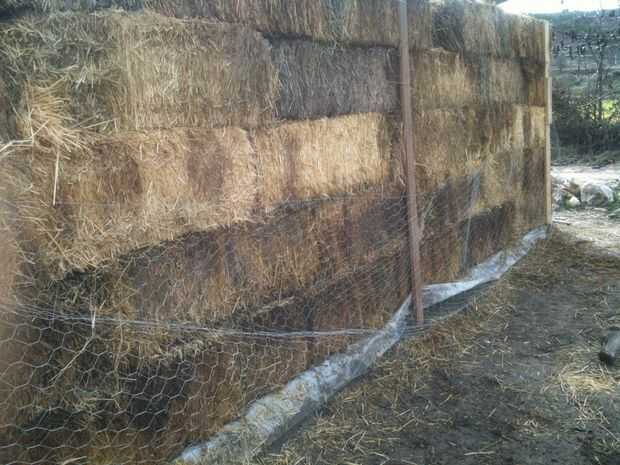 Me interrumpió después de 5 filas, esperando la hoja plástica de la azotea y luego poner la fila 6 º de strawbales encima del plástico. Pero todavía no.