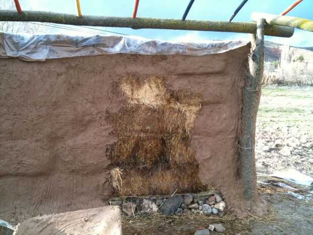 Preparan el barro. Estaba tratando de ser tan rápido como sea posible y toke el barro mojado recto como lo fue en sitio, así que muchas piedras pequeñas, roten pedazos de madera, bugs y cosas que tiene incorporado en la pared. No es gran cosa. Sólo haz una weelbarrow llena de eso Arcilla Rica, añadir algo de agua, despegue en tiempo mínimo 5 minutos con la pala, esperar 5 minutos, despegue en tiempo mínimo otra vez y listo. Probablemente un poco de arena en la mezcla le ayudará con problemas de fisuras pero ninguno disponible era tan yo skeep él. Tengo algunos alambre de pollo a la estructura de madera para reforzar el lado externo y alguna paja mezclada con barro en el interior sólo para probar la prórroga de las diferencias. La pared siguiente será sin chikenwire, paja en ambos lados es más que suficiente.