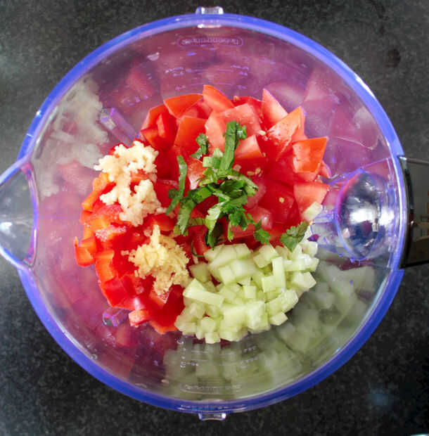 Aproximadamente, picar el tomate, pepino (tomar la piel primero) y pimienta y pop en su licuadora. Picar el ajo, el jengibre y el cilantro y agregue a la sociedad vierte en los ingredientes líquidos y luego pulso en la licuadora hasta que bastante suave.