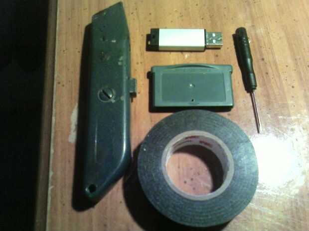 que cortar la caja de plástico en mi viejo pendrive de 1G y un nuevo caso usando un trozo de tubo de cobre y los transistores de un teléfono antiguo.  Usé una sierra, un martillo, un conjunto de archivos, un soldador y una pistola de pegamento calien