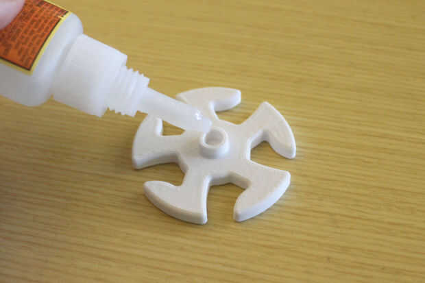 Nota: No aplique demasiado pegamento. Si lo haces, fluirá hacia arriba y sobre el eje por encima de la rueda y esto hará que el ajuste entre el eje y el eje mayor y más difícil de girar, que no es bueno! Sólo tiene que añadir un pequeño toque de pegamento en la parte inferior del orificio de las ruedas y engranajes.
