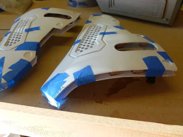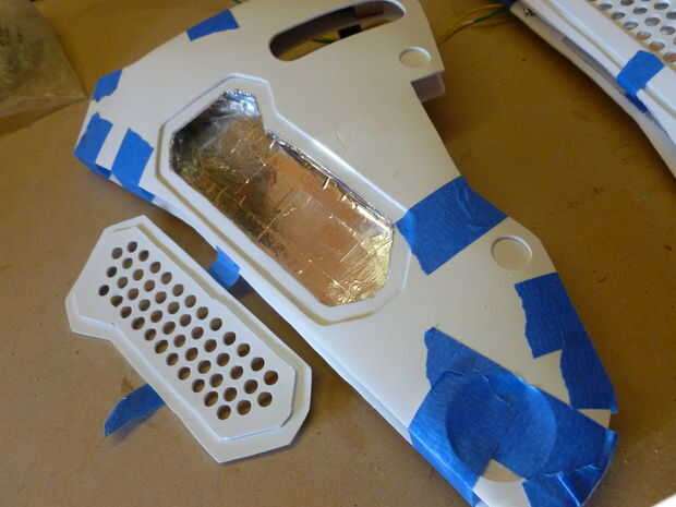 Utilizando los planos, había trazado de los patrones en estas piezas y recorto usando mi sierra y Dremel. También corté todas las formas y orificios internos. Cuadro 3 muestra el resultado de este trabajo. La ventilación cubre también pasó algún tiempo de calidad en el taladro de perforación muchos muchos agujeros. Tedioso. El siguiente es hasta los espaciadores. He cortado un montón de bloques pequeños de 1/2 de pulgada y había pegado todo alrededor de los bordes y alrededor de la mitad de apoyo. La pieza superior entonces estuviera pegada a estos y tuve una buena superficie sólida. Estos bloques también bloquear la forma, impidiendo que los paneles a flex-importante. Cuadro 4 se muestra un panel pegado junto y secado. La cinta de pintor azul está allí para sostener todo junto mientras se seca. Tuve un rollo de cinta de aluminio que cubre la cámara de luz, lo que es tan reflexivo como sea posible. Esto funcionó muy bien, como la cinta de aluminio es increíblemente delgado y muy reflexivo. Puedes ver en la imagen 5 cómo brillante es.