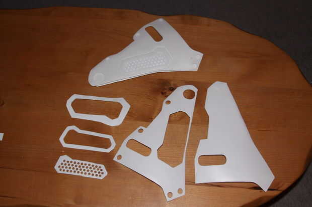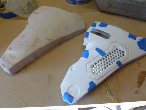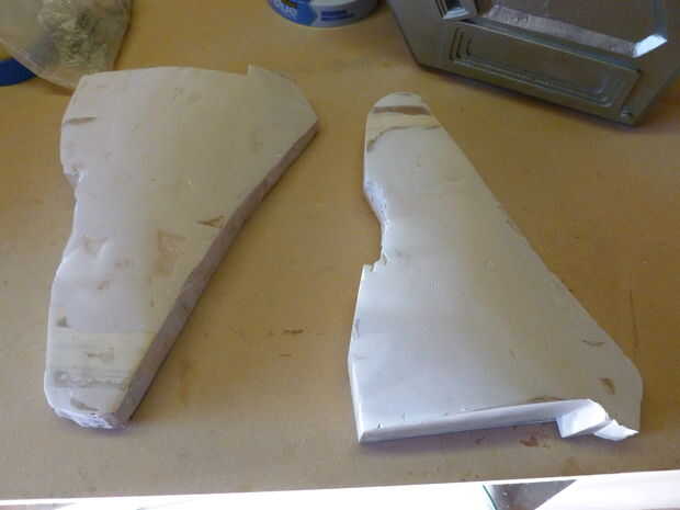 Lo primero que hice fue cortar las formas de estas 2 caras de MDF de 1/4" de manera que tendría la forma adecuada para trabajar con. El siguiente paso fue entrar en el modelo 3D y agarra las secciones transversales de las curvas. Hice esto cada 2 pulgadas o tan y corte hacia fuera las formas para crear una estructura de la costilla en las placas base. Luego rellena los huecos con restos de madera y aplica una capa de Bondo sobre la superficie a rellenar en cualquier puntos bajos. Después de algún tiempo bajo mi lijadora de mano, tenía una superficie que parecía imagen 1. Usted notará que son un espejo de cada uno y representan la forma de cada lado.