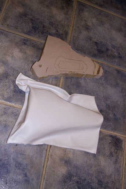 El siguiente paso es dar forma a las láminas de plástico a estas formas. Corta 4 trozos grandes de plástico de hoja de estireno a unos 3" más grande que la forma. Había precalentado el horno a 350 grados. Desde poner el plástico en la parrilla sería una mala idea, cogí un pequeño panel de cristal de IKEA para algo así como 5 dólares y poner en el horno. Esta pieza de vidrio es ligeramente más grande y luego las piezas de plástico que voy a poner en ellos. Una vez que el vidrio se calienta arrojó la primera hoja de estireno en el horno. Mantengo una estrecha vigilancia sobre él, comprobándolo cada 15 segundos o así para ver si es suave. Probablemente tomó aproximadamente un minuto. Utiliza un par de guantes de trabajo gruesos, me sacó la hoja y comencé inmediatamente presionando sobre la forma para el primer panel lateral. Una vez que haya enfriado y endurecido el plástico, ahora tenía la superficie curvada. Puedes ver lo que parece en la figura 2. Repetí este proceso 3 veces para darme los pedazos principales necesitados.