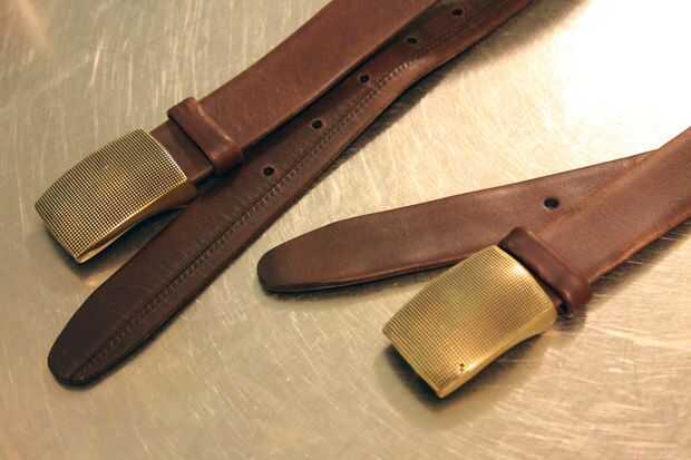 Hay dos lugares en esta arma que ata con correa de cuero. La primera es las 2 tiras en la parte superior del núcleo central de la pistola. El segundo es todo el clip. Si saltas hacia atrás a la de las fotos de referencia, a ver estos lugares. Hice un montón de investigación en diversos tipos de restos de cuero encontrados en Ebay, pero nada de eso realmente encajar lo que estaba buscando en las correas de la excavadora. Finalmente he decidido que las correas de cuero se van a ser mi mejor apuesta. Revisé un par de ahorro local almacena y tuvo la suerte de encontrar 2 correas que emparejan que eran apenas el tamaño correcto y el color, imagen 1. Necesitaba 2 cinturones debido a la cantidad de cuero que se ata con correa de la pistola. Corté la correa hacia abajo para las diferentes piezas de tamaño necesario y entonces comenzó el les desgaste. No se tienen las correas de cuero mirando todo new-ish en un arma que es tan paliza y sucio. Introduzca el papel de lija y Limas gruesas.
