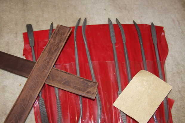 Envejecimiento de la piel es bastante fácil de hacer. Comencé tomando una lija de grano áspero y desbaste hasta los bordes de todas las piezas para que se vean un poco mas gastadas. Luego tomó una escofina y utiliza sus bordes muy afilados para agregar algunos pequeños y algunos profundos arañazos en la superficie de la piel. Si no tienes Limas gruesas, puede utilizar cualquier cosa con un filo áspero para lograr la misma apariencia. Luego hice una segunda pasada con la lija áspera hasta la superficie de la piel un poco, pero no tan áspero como los bordes recibidos. Puedes ver el resultado de este proceso en la figura 2.