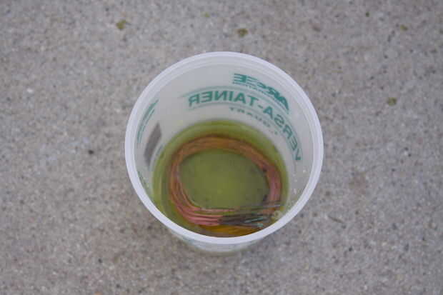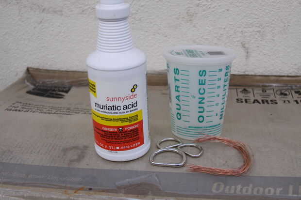 En su mayor parte sólo he seguido el proceso descrito en el enlace de arriba. Comencé por recoger una botella de ácido muriático, cuadro 2, que está disponible en la mayoría de las ferreterías. No debería tener demasiados problemas en encontrar como se utiliza para limpiar piscinas y calzadas concreto. Para que sepas, ácido muriático es ácido clorhídrico por lo que es peligroso. Empecé por verter aproximadamente una pulgada del ácido en el recipiente de plástico y añadiendo el alambre de cobre, cualquier cobre hará, incluso monedas. Puse el cubo en un lugar seguro fuera de con un montón de ventilación donde sería capaces de acceder a personas y animales. Es importante no ponga la tapa totalmente, como el ácido comiendo el cobre genera gas, y si la tapa está en apretado el cubo podría explotar. He dejado la solución para un día dar un montón de tiempo para el cobre disolver. Observará en el cuadro 3 que el ácido normalmente claro ha vuelto verde.
