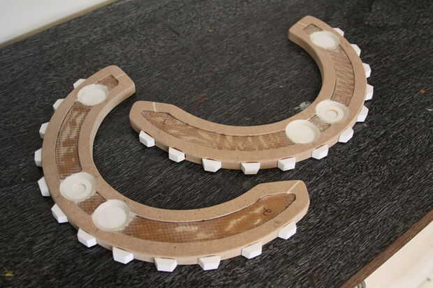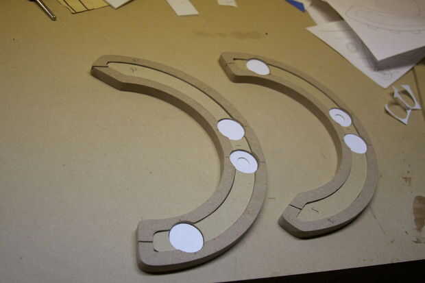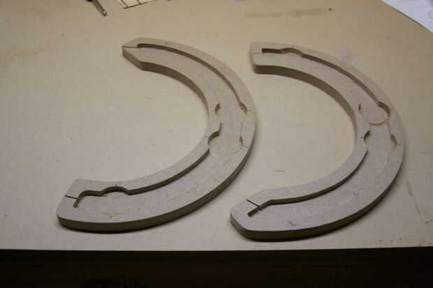 Comencé cortando la forma principal dos veces de MDF de 1/4" para cada equipo. Cuadro 1 muestra las 2 piezas pegadas donde las mejores piezas tienen ya todos de corte interno hay salidas de hecho. Llenaré de las marcas de corte en cada extremo con Apoxie esculpir más adelante. El siguiente paso es trabajar sobre cómo agregar el detalle interior. Cortar discos de plástico para crear las capas en las 3 depresiones circulares de cada pieza. Se añadió también una pieza más fina de madera relleno para levantar la cavidad de centro. Véase el cuadro 2. Esta cavidad interior tiene una superficie con textura en el modelo. Fui a la tienda de hobby local y recogió una pieza de plástico con textura de la sección de tren modelo. El plástico fue cortado para que coincida con la forma de las zonas interiores y pegado en lugar. Apoxie esculpir otra vez fue agregado a las áreas circulares para biselar los bordes. La última cosa a hacer era añadir los dientes a la parte exterior de los engranajes. Trozos gruesos de hoja de estireno a estos dientes y había pegado en su lugar con pegamento. Puedes ver el resultado de esto y el plástico de textura en el cuadro 3. Todavía hay 2 piezas de detalles adicionales como el fleje para que voy a llegar a más tarde.