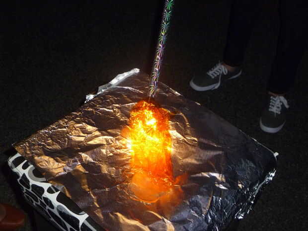 Die heiße Masse aus Glas en eine Stahlplatte um zu formen gissen um eine habe cilindirsh von geben.