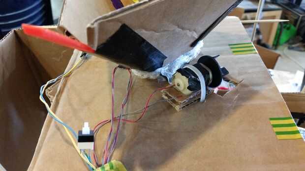 El cono en la parte superior del sistema es donde vienen los munchies. Dejaron por el motor de bigotes que intenta sacudirlas, intentando separar los que sticked juntos. En la parte superior del tablero de alimentación verás un motor vibrante (un motor con excéntrico masa unida a él). Sólo se enciende cuando no hay munchies cayendo por un segundo. Cuando no hay munchies por 5 segundos (se pegan cosas!) el motor se da vuelta todo el poder completo.