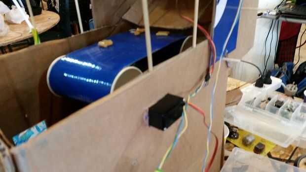 La cinta transportadora, en la primera versión se hace de las tazas de dos papel pegadas con una cinta. El aix es un pincho, mantiene en su lugar con pegamento caliente. El pegamento caliente también conecta el pincho al eje del motor. Sorprendentemente, sostiene el esfuerzo de torsión!