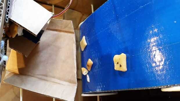 Una vez liberado de la toma de cono vibrante, el munchies deslicen hacia abajo y golpea la cinta transportadora giratoria. Esto los separa más. Tiraron a 30fps con la cámara, y la salida es enviada via bluetooth a la computadora principal.