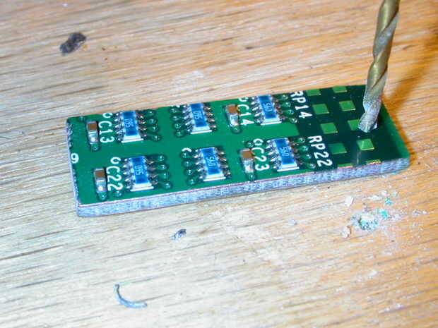 Perforar agujeros en las tapas de los tableros para sujetar el hardware pendiente. Un 1/16" bits funcionó a la perfección. Utilice un trozo de madera para que lo apoyen y que vayas despacio para evitar astilladuras. Lento y constante gana la carrera.