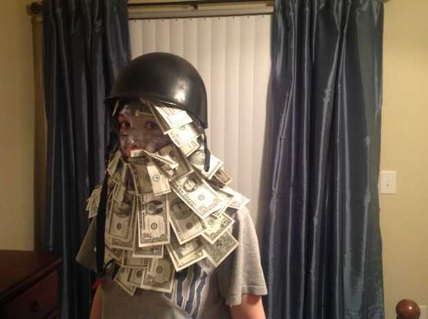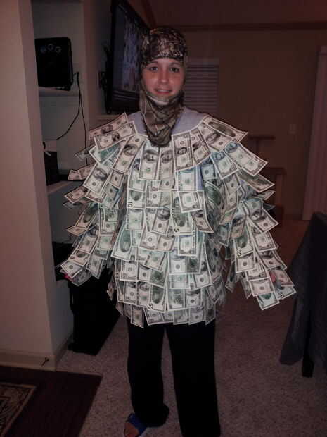 he utilizado una funda cabeza hecha para cazadores y utiliza el mismo concepto, comencé a pegar facturas en la parte inferior mi forma de trabajo para arriba. No preocuparse de que la cabeza parece exactamente igual que el traje ya que iba a usar un casco de motocicleta. Usé la parte de la manga que puede cubrir la boca como el "barba". Me dobla cada factura en mitades y cuartos, para hacerlos más pequeños y pegado a la parte de las mangas, metiendo en la tela para crear la barba.