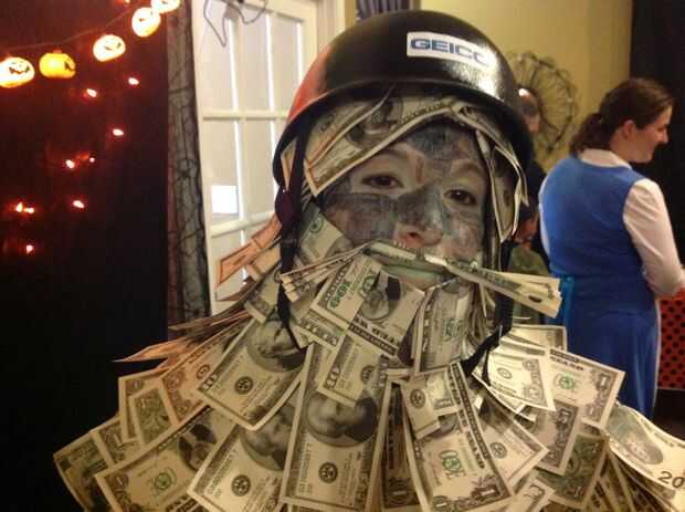 Si te fijas en el rostro de guy real, parece que tiene billetes de un dólar, especialmente en la mejilla izquierda y la frente. La única manera que sabía hacerlo, fue fácil, ponerte tatuajes temporales. No pude encontrar ningún tatuajes hechos de antemano, por lo que adquirió el papel del tatuaje en línea, insertar varias imágenes de la parte posterior de un billete de un dólar en Microsoft Word e imprimir mis propios tatuajes temporales. Sólo tenía unas cuantas hojas de papel, así que no puedo practicar mi rostro completo hasta el debut. Mientras que los tatuajes se veía bien, era difícil que se vean mezclados con maquillaje. Además, eran rígidos y difíciles de quitar. Así que opté por usar estrictamente maquillaje en su lugar. Usé un corrector de color verde de la menta y mezclado de blanco maquillaje y polvo con ella para que se vea textura. A pesar de que no era el color exacto del dinero, mezclado en el pozo, especialmente en la iluminación oscura.
