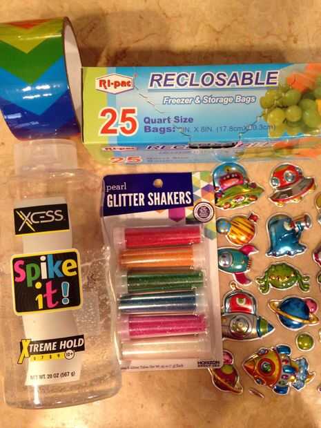 1. gel para el cabello (yo tengo la mía desde el almacén del dólar) 2. "Ziplock" tipo bolsas de plástico (también tengo de la tienda de dólar) 3. cinta heavy duty (Yup, lo has adivinado desde el almacén del dólar) 4. pegatinas (o realmente cualquier cosa que no tiene bordes afilados) 5. brillo