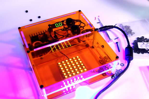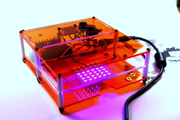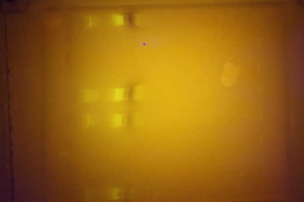 Este sistema le permite hacer los tres en un factor de forma compacta. El gel directamente en la bandeja, que luego se carga con muestras de ADN e insertado en la cámara inferior de la caja, que puede ser sen en la figura 2. Al encender con el botón superior en el cuadro 1, la tensión le indicará un voltaje en las terminales. Una vez que esto sucede, los fragmentos de DNA migrarán en el gel, y gases comenzará a formar en los electrodos (imagen 5). Condensación se iniciará en la cámara inferior de la nube. Sin embargo, el gel se puede mover a la cámara superior en cualquier tiempo e iluminado con el panel de LED azul, que le permite ver el progreso, o para ver los resultados finales.
