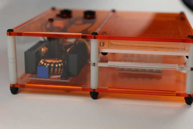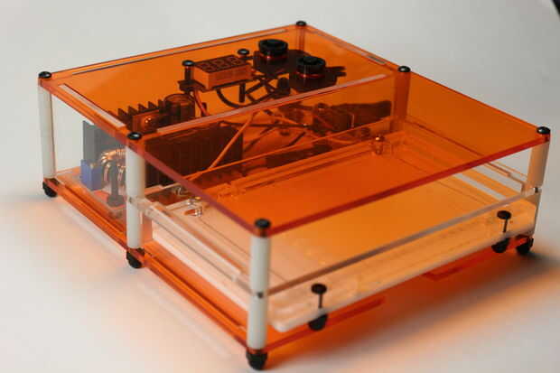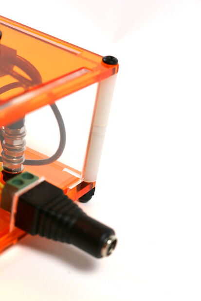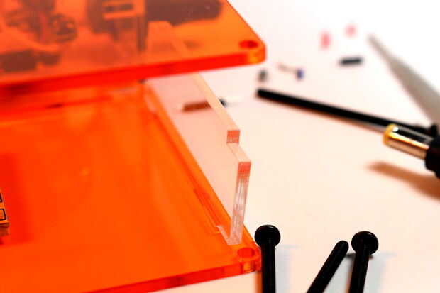 Una vez en las piezas, ajuste las tapas de las cuatro piezas en la placa superior de la naranja. El cuadro está casi listo! Ahora el siguiente paso es agregar los espaciadores y los pernos. Coge dos. 75" distanciadores largos y uno. 125" espaciador. Éstos apoyan la parte posterior de la caja. Puedes ver en el cuadro cuatro. Ambos agujeros traseras utilizan esta pila de espaciadores. Poner debajo del orificio de montaje y deje un 2" negro óxido acabado gota de 4-40 a través de ellos. Luego tapa el tornillo con una tuerca de la bellota. Asegúrese de que la tuerca es en la parte inferior de los actos de la caja es como un pie para la caja.