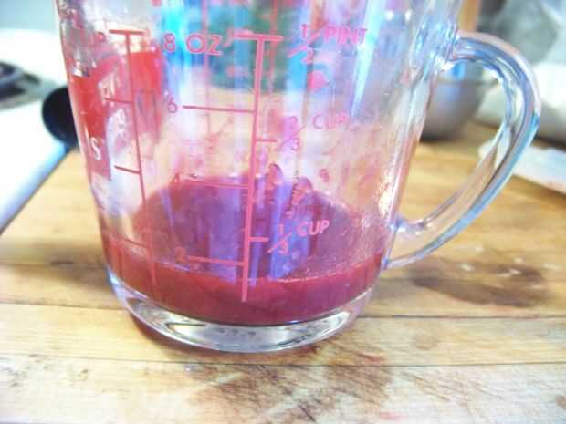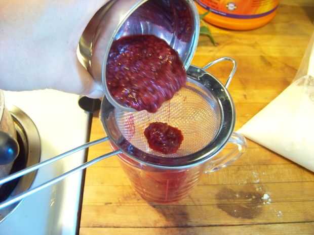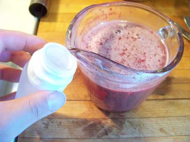 De bayas en un recipiente aparte, caliente 1/4 taza de bayas hasta convertirse en aguadas, después presione a través de tamiz para quitar pieles de semillas. Añadir el tamizado para gel. d 1/2 cucharadita ácido cítrico si se desea para la acidez.