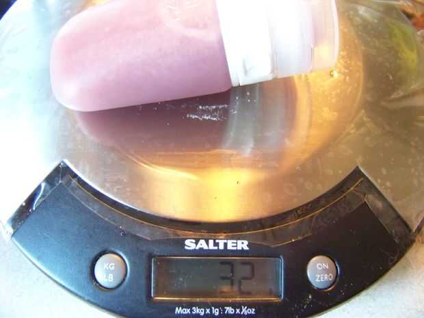 Esta receta hace 2 1/3 tazas, o 480 gramos. Empaquetado para arriba en el tubo de 1.25 oz, el contenido pesa 32 gramos - comparables a geles de energía comercial. (Hay espacio para un gramo o dos más).