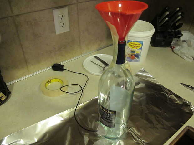 Pongo una capa de adhesivo de refuerzo sobre el pegamento caliente que utiliza para el cable de alimentación, en caso de que el gel vuelva a derretir el pegamento caliente. No he tenido problemas haciéndolo de esta manera. Empecé con un embudo para verter la cera derretida en la botella, pero la cera se haya enfriado y había bloqueado el embudo antes de que la botella estaba llena. La cera es lo suficientemente gruesa como para que se puede verter directamente en la botella como usted tomarlo lento.