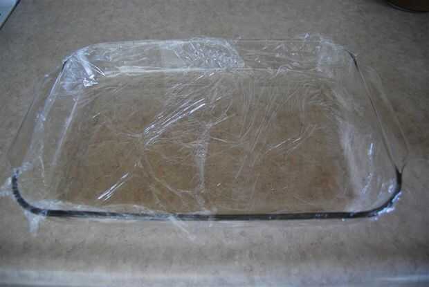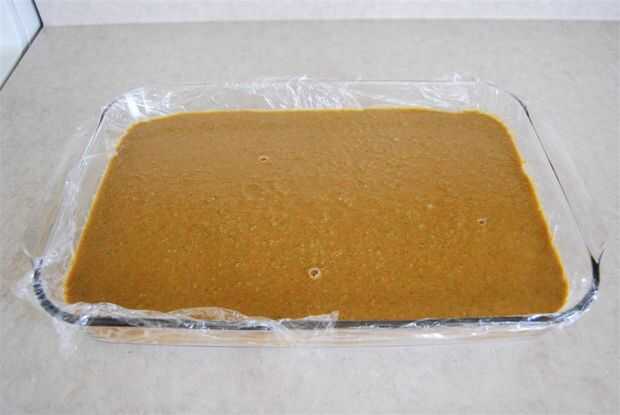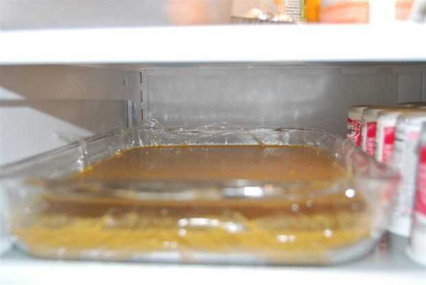 Línea un pan con abrigo claro.  Vierta su mezcla alimentos caldosos e incluso que si es necesario.  Poner en la nevera hasta que seque.  Salí de mina a reposar unas 6 horas.