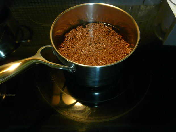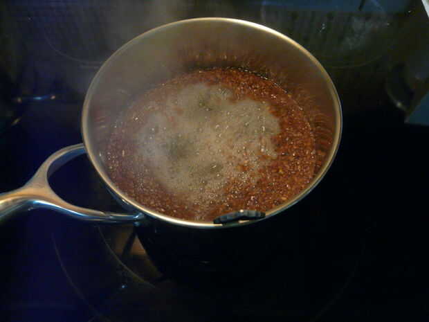 Coloque 1/4 taza (60 gramos) de semillas de lino en una cacerola y agregue 4 tazas (1 litro) de agua.