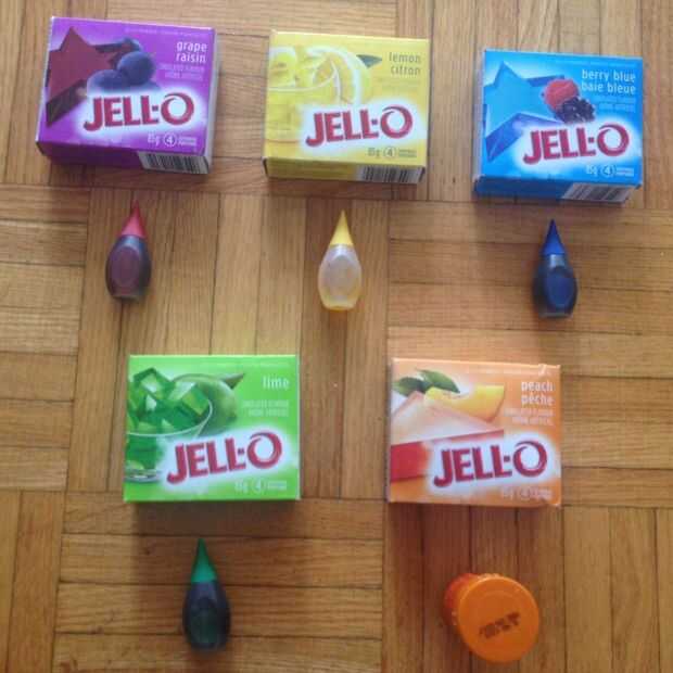 5 mezcla diferentes de Jell-o, se necesita 1 cucharada de cada mezcla.