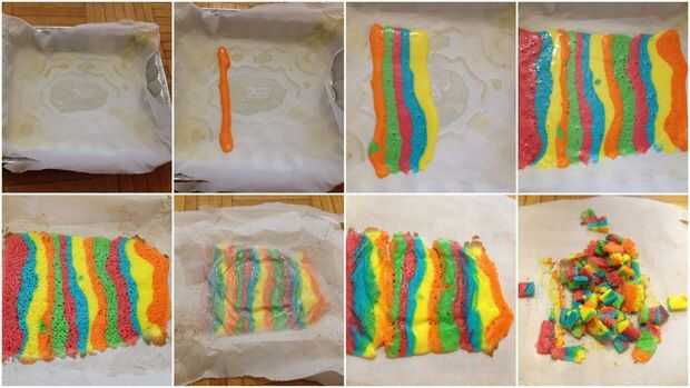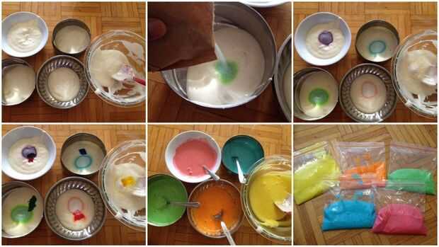 Añadir la mezcla de cada porción un jello-o diferentes. Luego añadir algunas gotas de colorante de alimentos respectivos a cada porción de masa de torta. Mezcle bien hasta obtener el color uniforme.