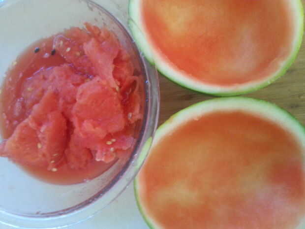 Cortar la sandía por la mitad, luego sacar el interior de ambas mitades en un plato. Asegúrese de obtener lo más cerca posible a la corteza.