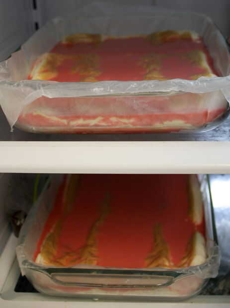 Espere hasta que la mezcla se enfríe a tibia, luego vierta sobre capa inferior volteada en la sartén, asegurándose de llenar todas las grietas y volver a la nevera a coagular.
