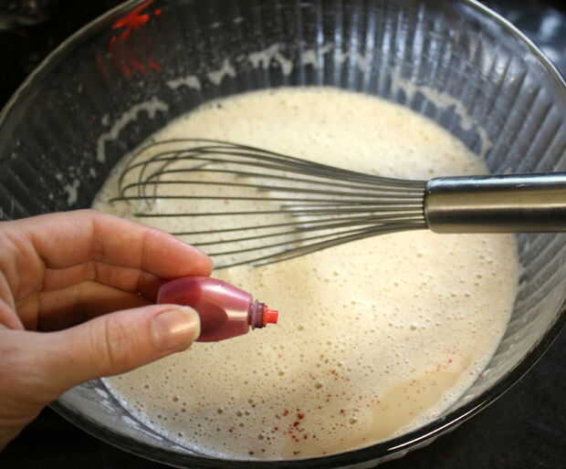 Batir 2/3 de taza con agua caliente y revuelva hasta que todo se disuelva. Añadir alimentos rojo colorante hasta que la mezcla llegue a tu color de carne recomendado: tocino. (Hubiera preferido un rojo más oscuro, pero se quedó sin colorante).