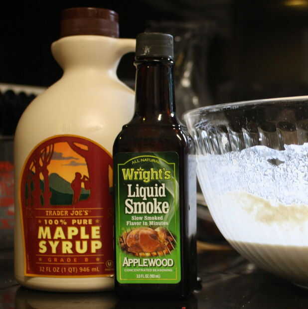 Combine 1 taza tocino/media-y media mezcla con 2 cucharadas de humo líquido y 2 cucharadas jarabe de arce. Espolvorear dos paquetes de gelatina sobre la superficie y dejar reposar durante unos 5 minutos a florecer.