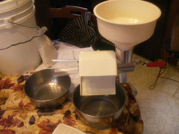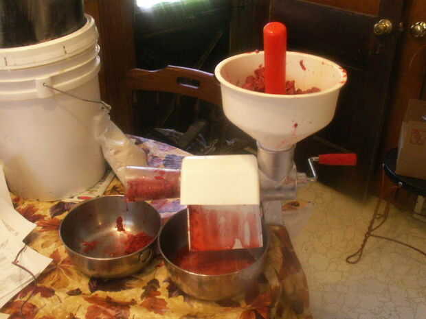 Una vez comienzas a abarrotar las bayas en la tolva en la parte superior y gire la manivela. El jugo y la pulpa con inician rezuma fuera del embudo y las semillas y tallos se viene el final en otro recipiente.