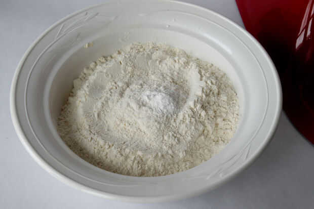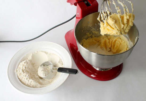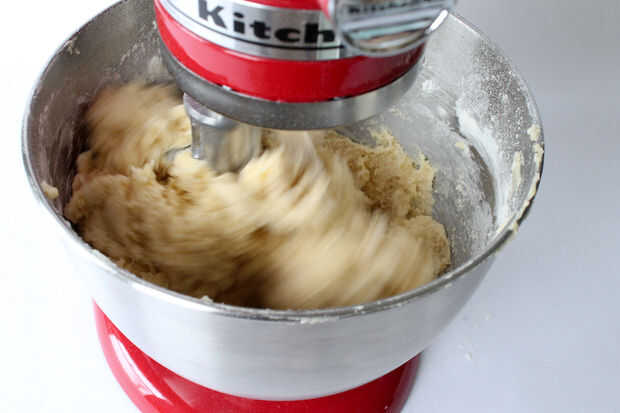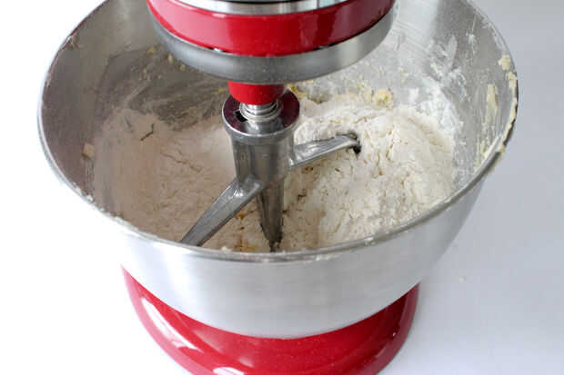 2. mezcla harina y polvo de hornear en un tazón separado. Batir poco a poco en la mezcla de harina. (Cambié mi accesorio de un "bate" a un accesorio "batidor plano" (para masa de galletas) que funcionó muy bien!)