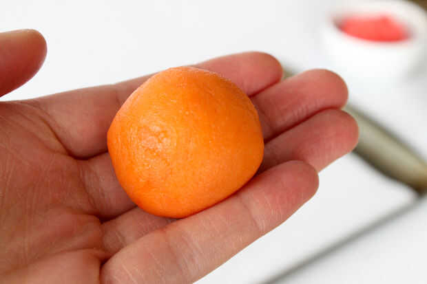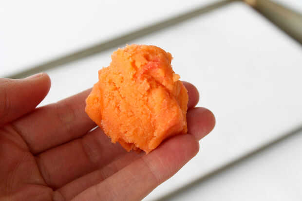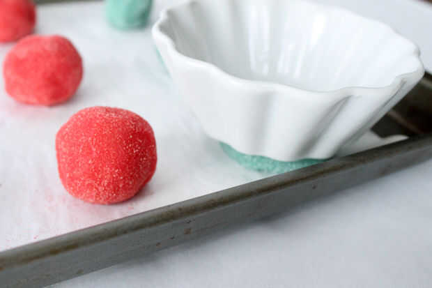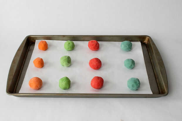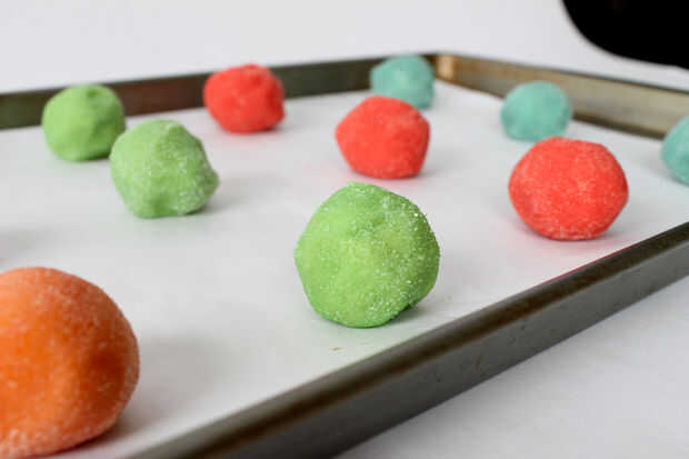 5. formar masa bolitas de 1 pulgada aproximadamente. Rodar en la gelatina extra de los paquetes. Coloque aproximadamente 2 pulgadas aparte, sobre moldes para galletas con papel antiadherente en. Aplanar con la parte inferior de un recipiente. No realizar en plana porque se separaron hacia fuera cuando cuece al horno así aplanar un poco!