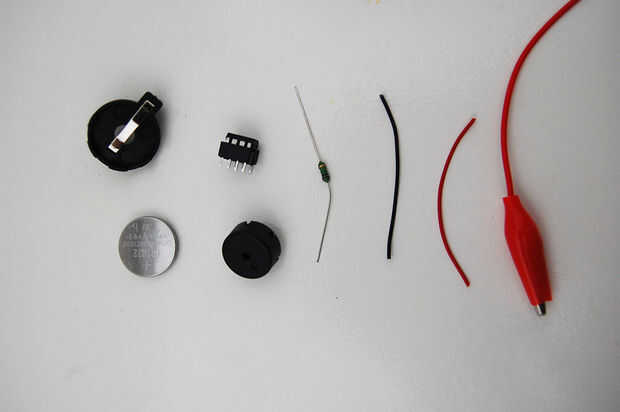 Necesario: 1 x ATtiny85 programador de la viruta (Sparkfun) 1 x ATtiny85 chip, 1 chip con 8 pernos, 1 batería de celda de botón (3V), 1 x pila de botón pilas soporte, 1 altavoz de x piezo, 1 x 1-Mega-ohmios de resistencia, alambre de montaje, cinta adhesiva, soldador, soldadura, pinzas cocodrilo.