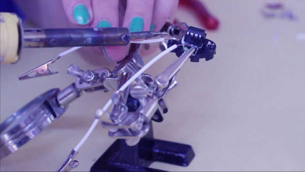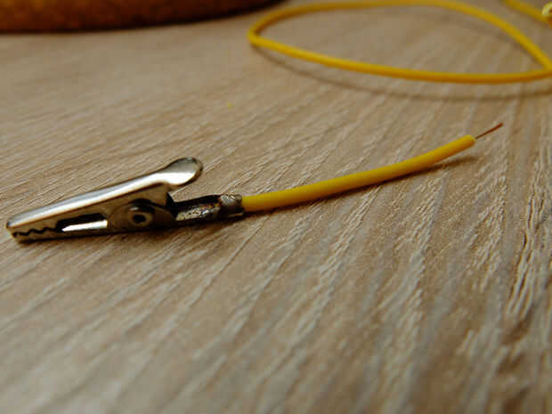 Cortar el alambre con crocodile clips, pero dejar unos 3 cm en cada extremo. Tira el último 0,5 cm de alambre, para poder soldar el cable en el chip. Soldadura de pinzas de cocodrilo a la clavija analógica 3 (el que está había soldado el resistor en) y uno al menos pin de soporte de la batería.