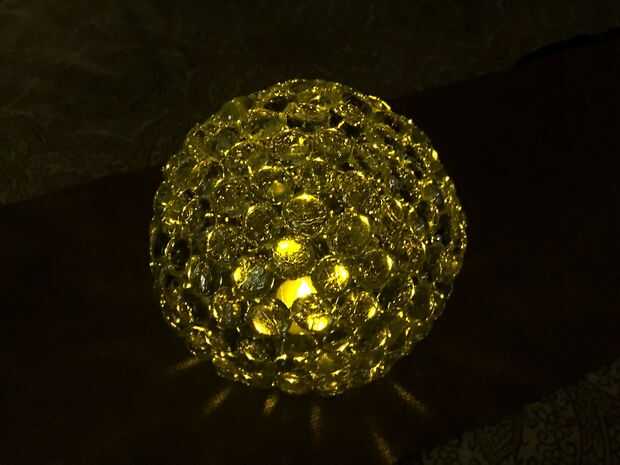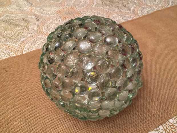 No sé cómo conecté los puntos entre un jarrón lleno de joyas de cristal y una bola gem, pero la conexión fue hecha y pasé una tarde pegar gemas de vidrio para un accesorio de luz de té de mesa única. Este proyecto requiere de mucha paciencia y una mano firme, pero el resultado final merece la pena.