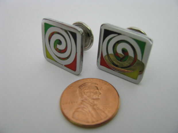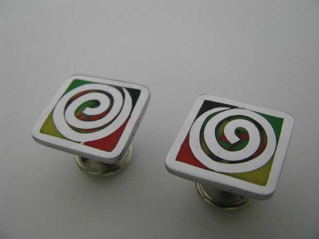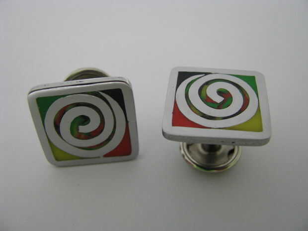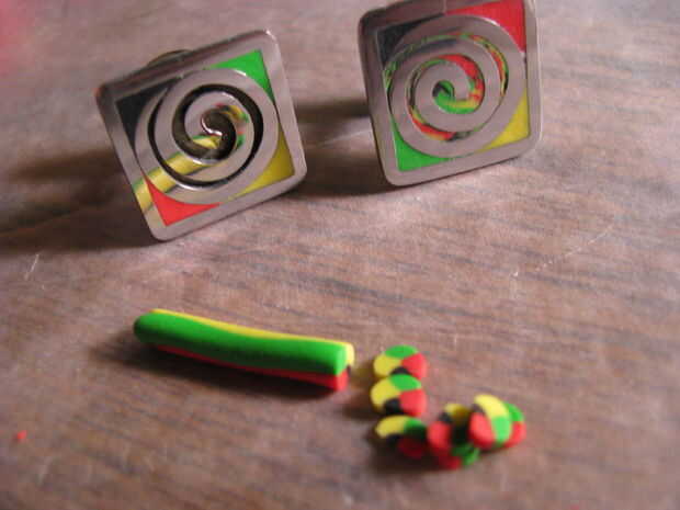 Hice estos gemelos tomando el alambre y formar un cuadrado y un espiral. Yo entonces les en un pedazo de chapa había soldada. A continuación presentó el cable plano y había lo había pulido. Me llena los huecos con arcilla polimérica los colores Rasta y había cocido en el horno.