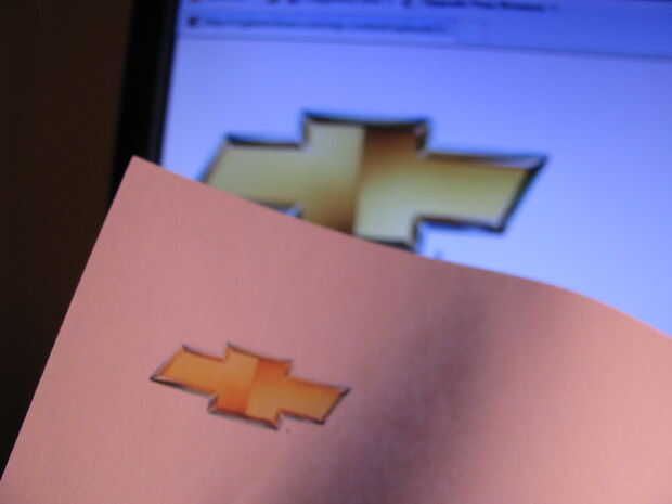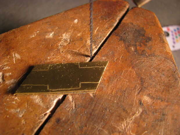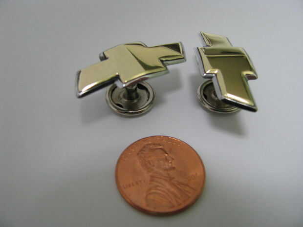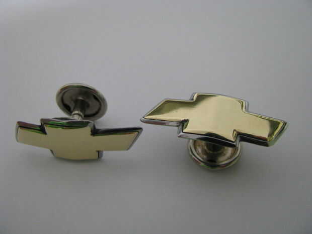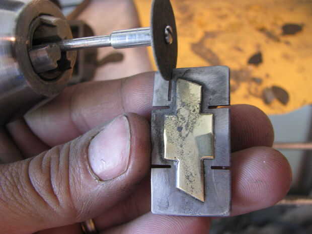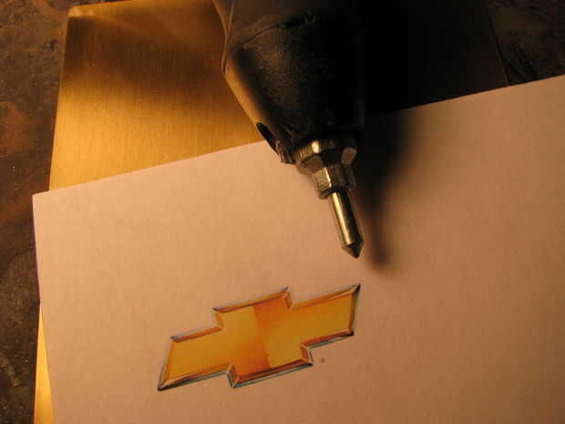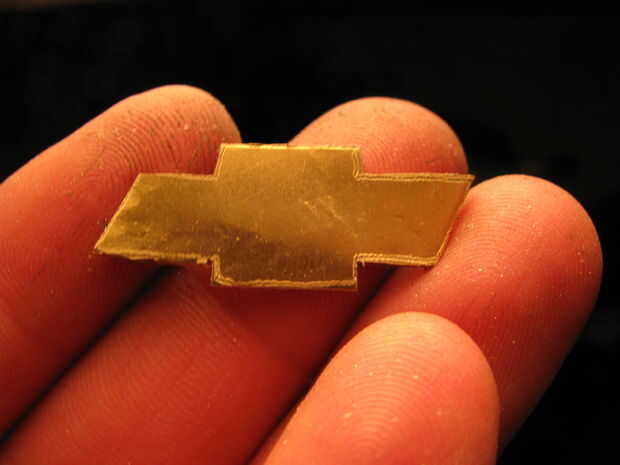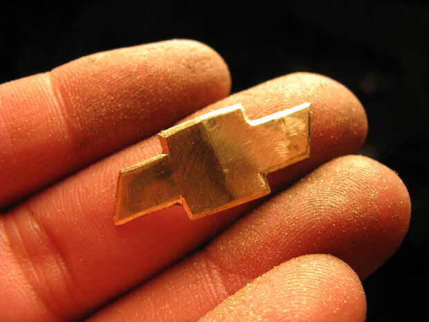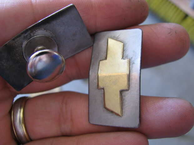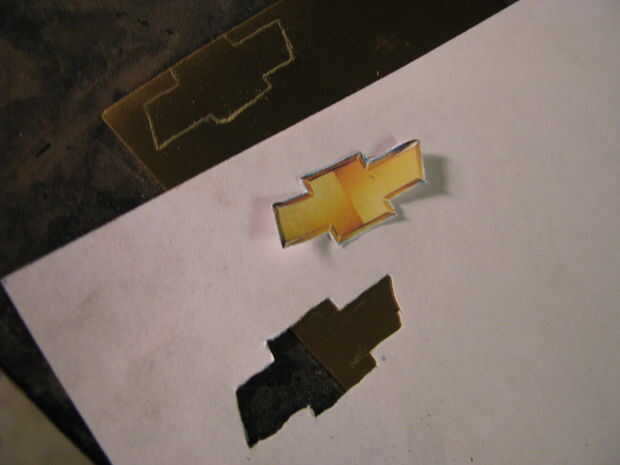 Corte un símbolo de la Chevy de latón y había chaflanado los bordes con una Lima. Luego lo en un pedazo de hoja de metal había soldado, corte el exceso y continuó en la forma de Chevy.