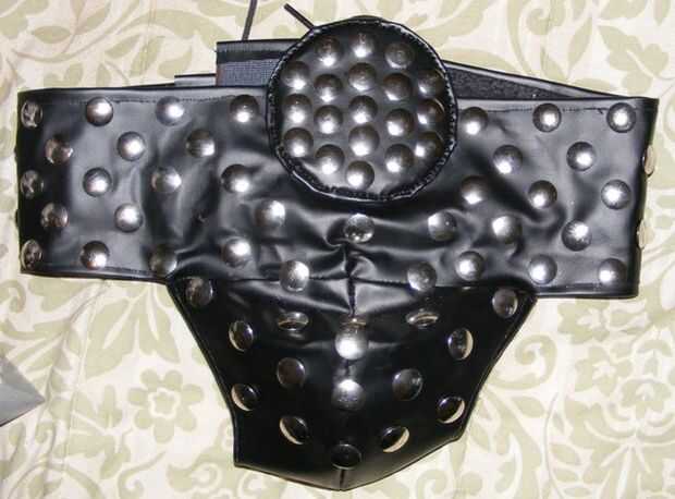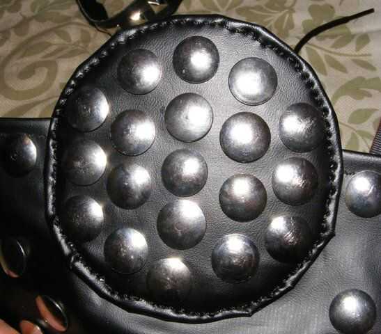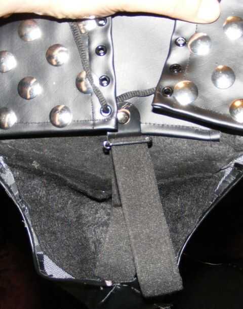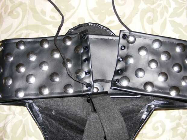 Luego cosí una cinta elástica negra que había rescatado de las hombreras al punto inferior de la entrepierna. Había llegado mi correa con una hebilla deslizante pequeño que había sido clavado en las hombreras, así que acaba de poner la bragueta a mi hijo, marcado el centro de la parte inferior de la lengüeta en el cordón de apertura y clava la hebilla a la lengua. Esto hizo una tira entrepiernas ajustable longitudinalmente para ayudar a mantener la bragueta en su lugar. Para agregar los espárragos, simplemente marque el patrón de pernos prisioneros quería en la parte trasera del vinilo y penetra a través de mis marcas con chincheta de una quilter. La vuelta la bragueta a la parte delantera y me asomó las chinchetas de quilter por todos los agujeros poco había hecho, entonces voltea sobre y martillado con cuidado los puntos de la chincheta sobre plano para garantizar a la bragueta, usando un libro de teléfono debajo para amortiguar la cabeza de la tachuela. Romper con algunos puntos en el proceso y tuvo que intentarlo de nuevo, pero la mayoría de las tachuelas martilladas sobre sólo muy bien al primer intento. Yo solía tachuelas cerca de 120 en conjunto stud la bragueta, pero su kilometraje puede variar.