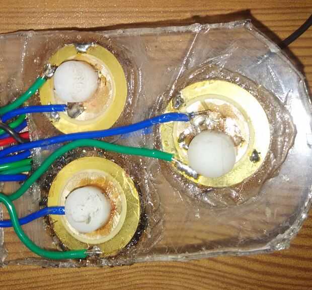 He arreglado 6 transductores piezoeléctricos a un material plástico flexible en forma de bocadillo, para que los elementos piezoeléctricos son curva fácilmente. Soldar los elementos piezoeléctricos individualmente para conectar al multiplicador de voltaje. He arreglado algún material de espuma para hacer fuerza a concentrarse en el centro del transductor piezoeléctrico y no dañar el elemento piezoeléctrico.